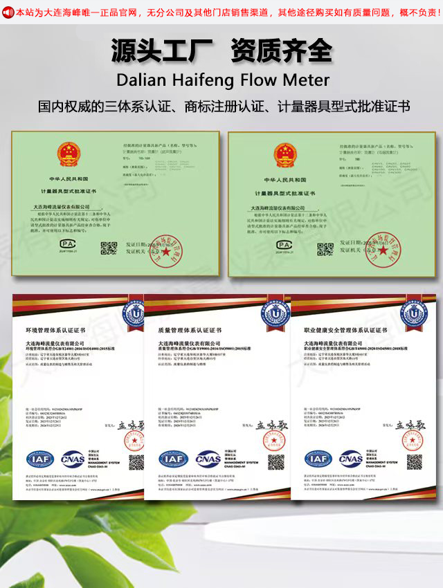 大连海峰流量仪表有限公司是一家开发设计,生产制造流量仪表的高技术型企业,专注流量仪表行业多年,取得由辽宁省市场监督局,根据中华人民共和国计量法,批准下发的计量器具型式批准证书,CPA证书号为2024F17014-21。公司荣获IS09001"质量管理体系认证"、ISO14001"环境管理体系认证"、ISO45001"职业健康管理体系认证",并拥有"dlhaifeng"品牌注册商标。公司主要生产电磁流量计、超声波流量计、涡轮流量计、罗茨流量计、涡街流量计等。公司拥有先进的液体和气体流量标定装置,液体标定最大口径DN2600,气体标定最大口径DN300。